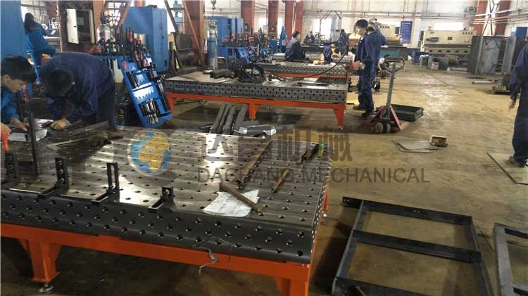 ①基礎件:如方形、矩形、圓形基礎板等,用作夾具工裝臺. 工作臺的五個工作面都有100mm×100mm(D28系列)或50mm×50mm(D16系列)的帶有網格標注的孔。其五個面的平面、平行、垂直公差精度以及孔與孔的位置精度都是非常高的,保證在臺面上的定位和臺面與其它模塊之間的組合都具有足夠的使用精度要求。基礎臺面的尺寸從1000mm×1000mm到4000mm×2000mm可以任意選擇,非標尺寸可以訂做。如果臺面與臺面組合后的精度要求很高,則可以使用導軌將它們連接起來。